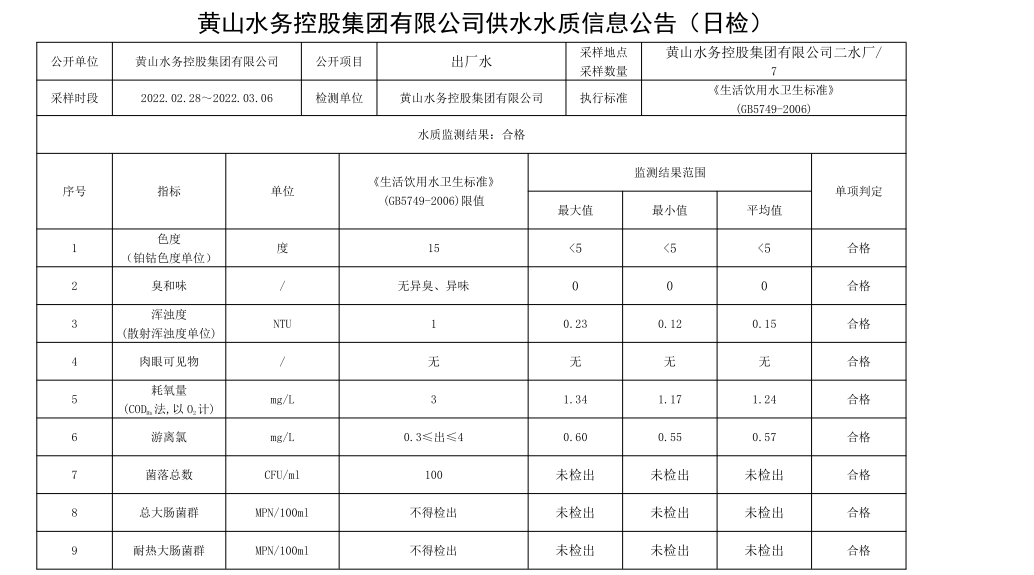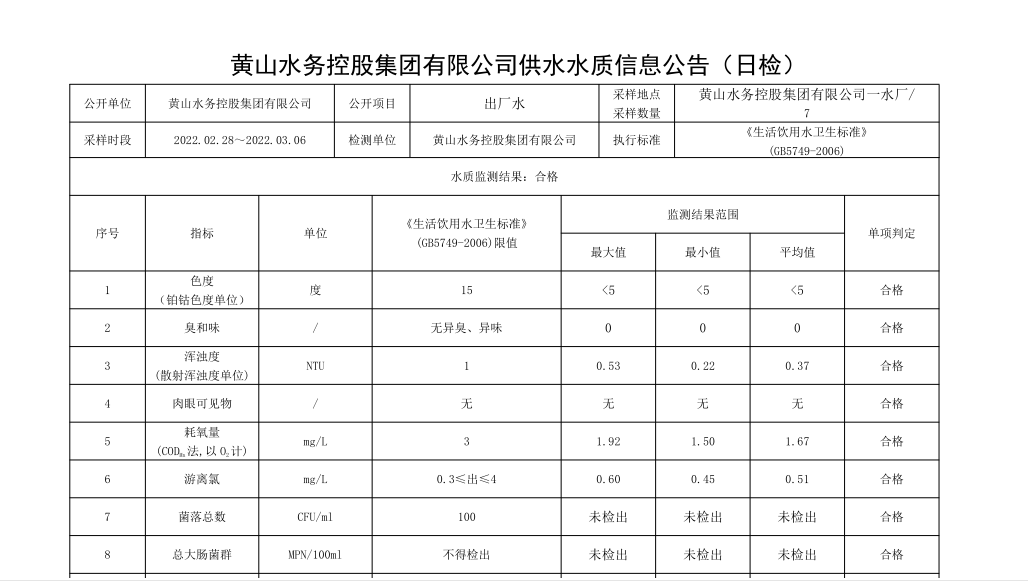 黃山水務控股集團有限公司供水水質信息公告【日檢,(2022.02.28_2022.03.06)】