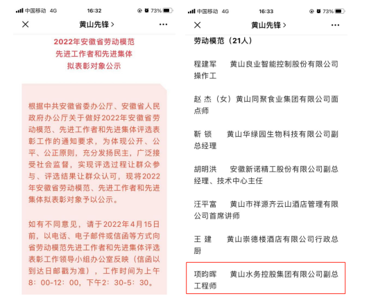 2022年4月11日,根據《中共安徽省委辦公廳、安徽省人民政府辦公廳關于做好2022年安徽省勞動模范、先進工作者和先進集體評選表彰工作的通知》要求,市總工會經過預選、函評、會評,確定擬認了29個安徽省勞動模范和先進工作者及4個省先進集體。黃山水務控股集團副總工程師項昀暉獲得2022年安徽省勞動模范、先進工作者和先進集體擬表彰對象。