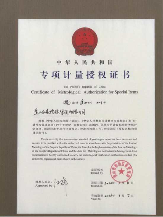 4月8日,黃山水務控股集團有限公司收到黃山市市場監(jiān)督管理局頒發(fā)的中華人民共和國《專項計量授權證書》,授權準予進行計量檢定、校準和檢測工作。
