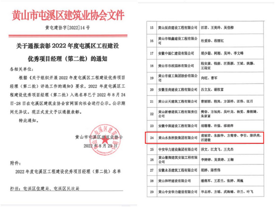 近日,2022年度屯溪區工程建設優秀項目經理評選結果公布,黃山水務控股集團有限公司6名項目經理獲此項殊榮。
