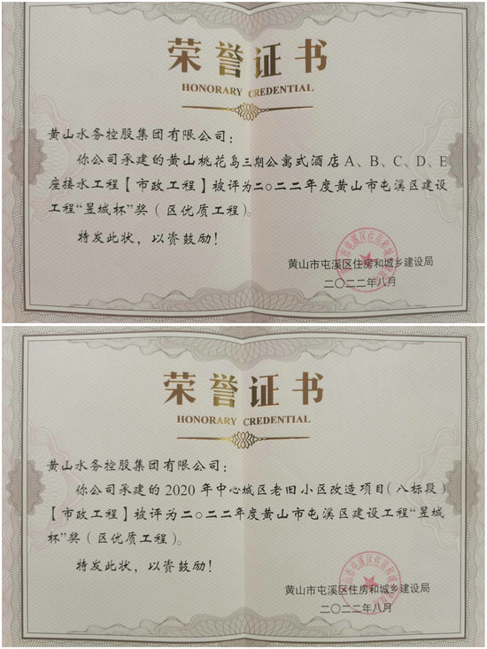 近日,由黃山水務控股集團有限公司負責承建的“黃山市2020年中心城區老舊小區改造項目(八標段)、黃山桃花島三期公寓式酒店A、B、C、D、E座接水工程”2項工程榮獲2022年度屯溪區建設工程“昱城杯”(區優質工程)優質工程獎,該獎項也是屯溪區建設工程質量方面最高榮譽獎項。